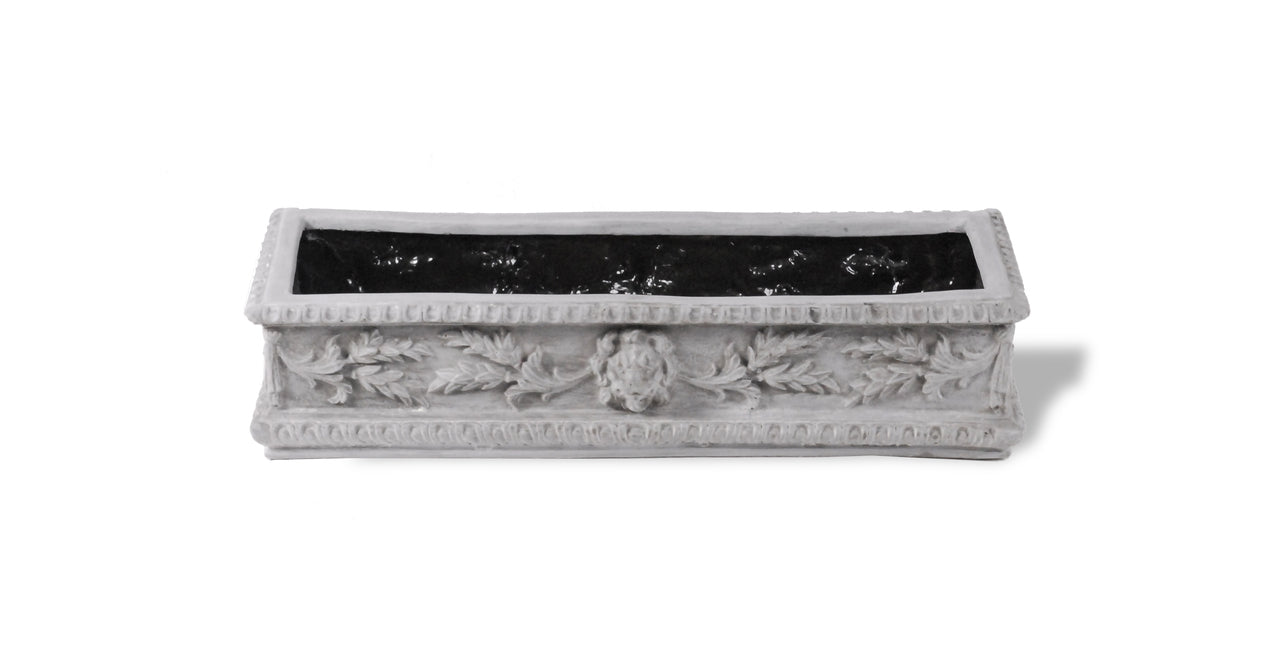 Enhance your garden with our elegant Lion Window Box. Featuring intricate garlands and scalloped edges, this ornate planter brings a touch of luxury to any outdoor space. The two lion heads on each side add a bold statement to your garden, making it a must-have for any garden enthusiast. Made in USA.